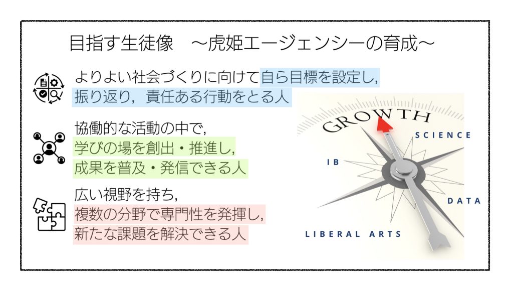 本校は、平成24年度に文部科学省からスーパーサイエンスハイスクール(SSH)の指定を受け、理数教育の研究開発に取り組んでいます。令和6年度からは、第Ⅲ期(文理融合基礎枠)指定校として、文理融合型の探究活動を中心としたカリキュラムにより、新たな価値を創造することのできる確かな探究力と創造力を持った生徒を育むことを目的とし、学際的な学びなどに取り組んでいます。
